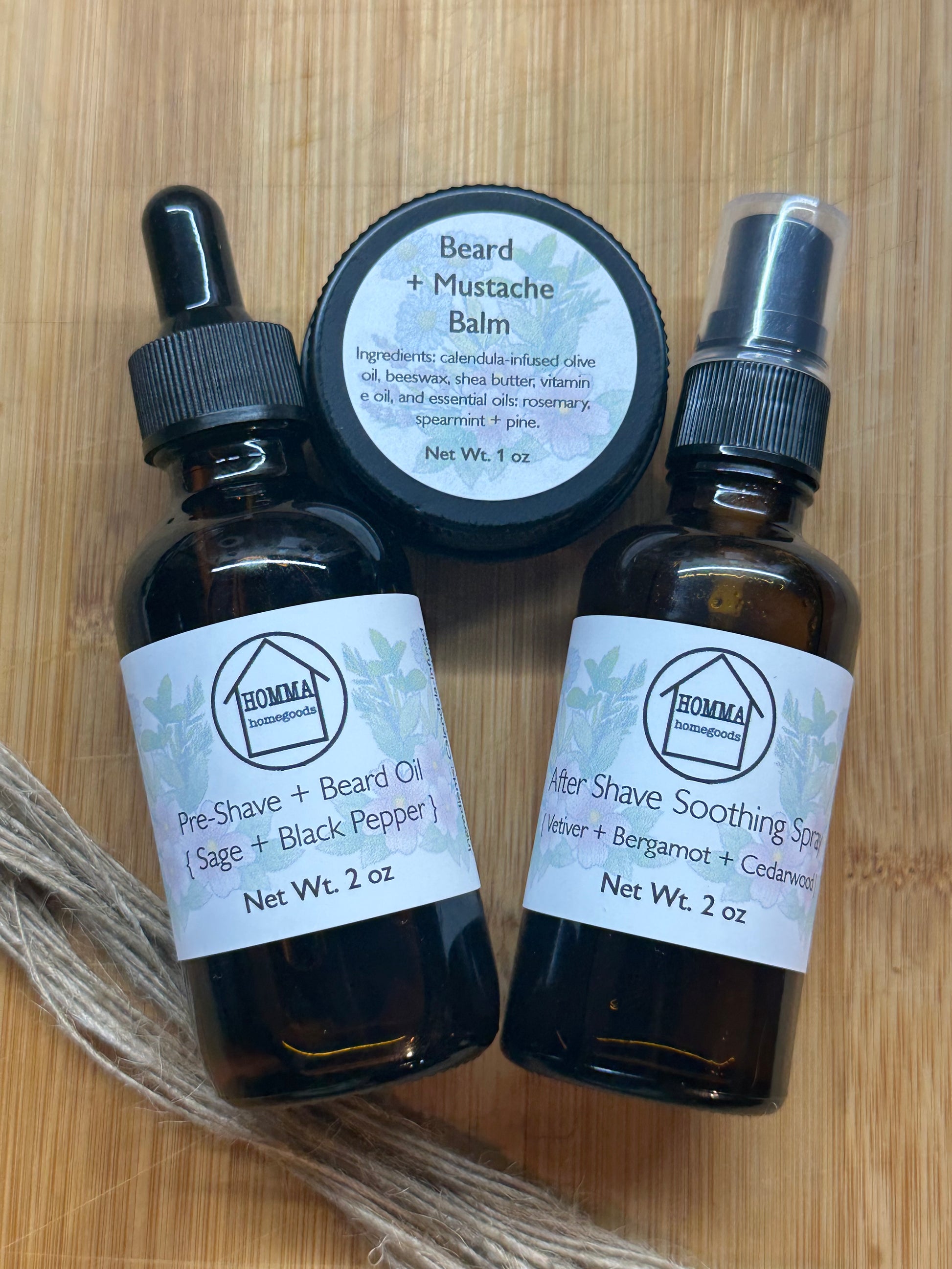 2 oz pre-shave + beard oil made with calendula infused olive oil, almond oil, vegetable glycerin, vitamin e oil, and sage & black pepper essential oils.